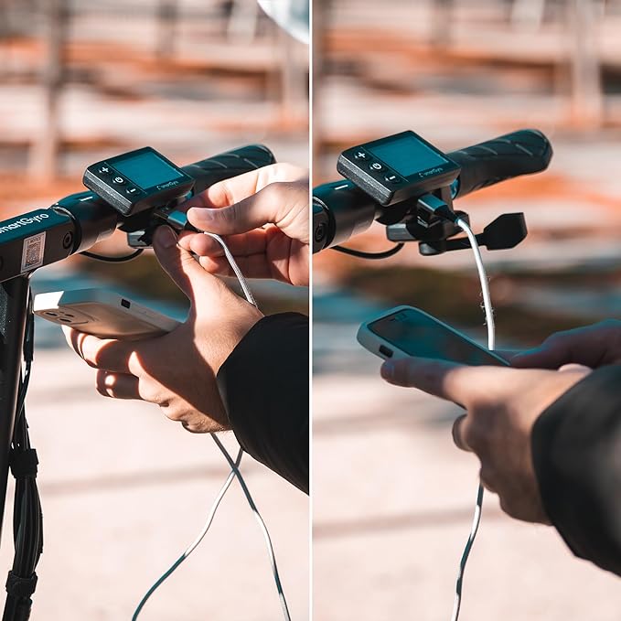- Resistant and stable 10" Tubeless Dual Grip pneumatic wheels prepared for driving on all types of terrain and disc brakes; display on the handlebar with battery information, km traveled, odometer, gear selector and scooter configuration